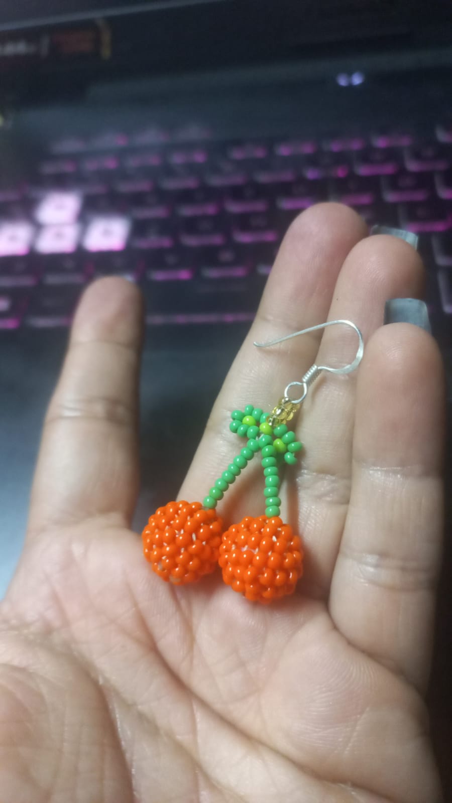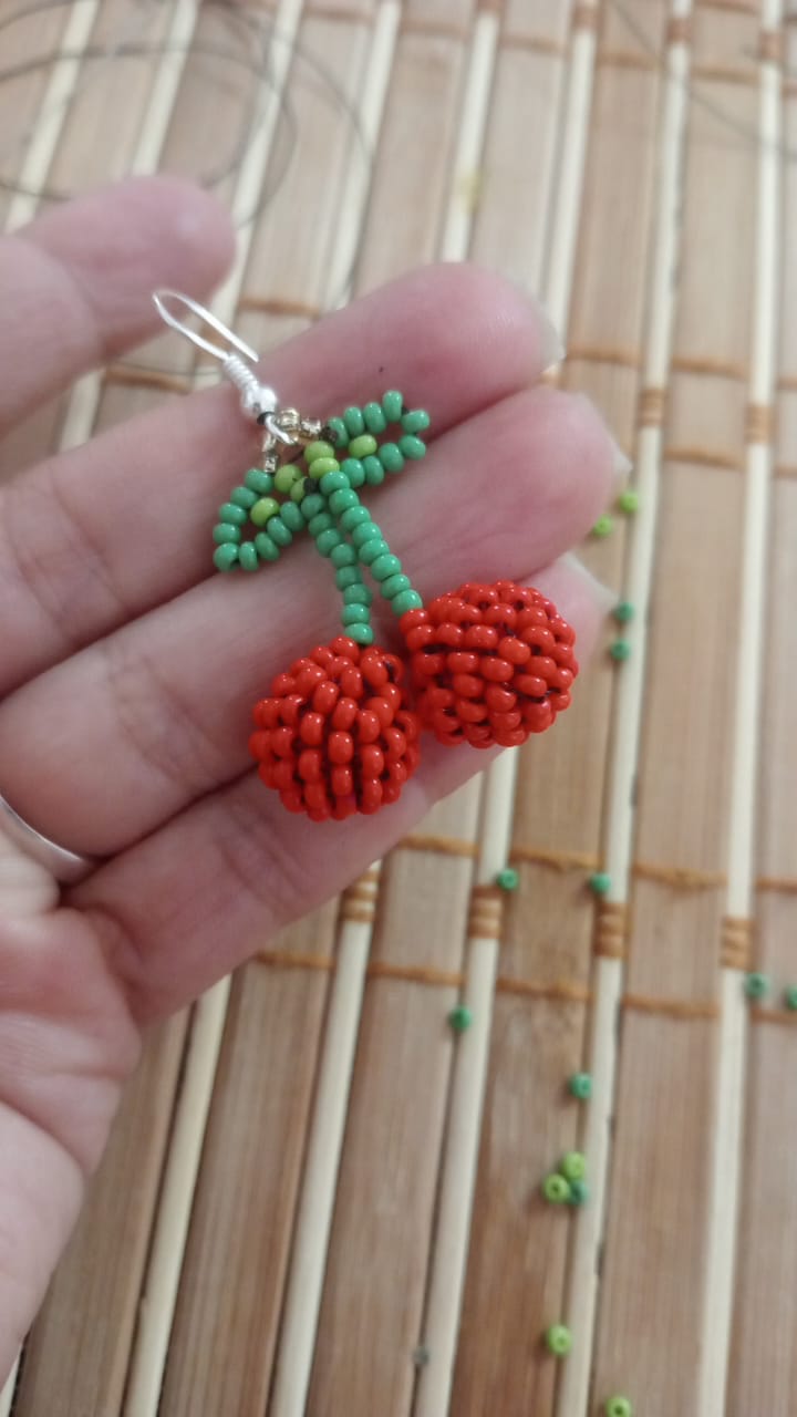 Un par de cerezas dulces y divertidas, tejidas en mostacilla con detalle y paciencia.